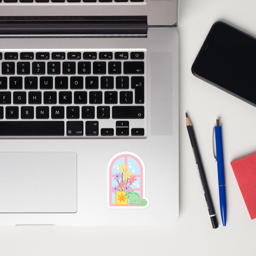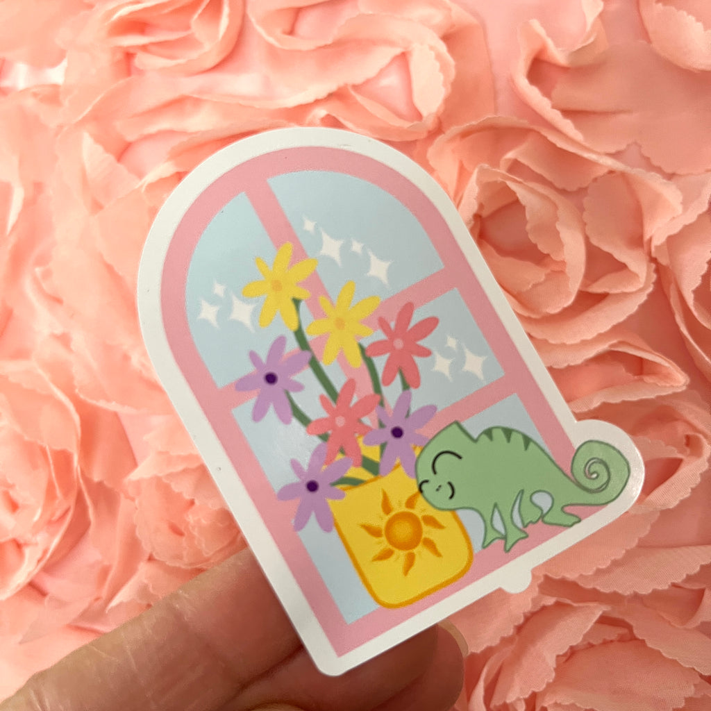 Dream of leaving the tower with this cute Disney Pascal Sticker, featuring Pascal sitting at the window with a vase of flowers. Perfect for Tangled fans.